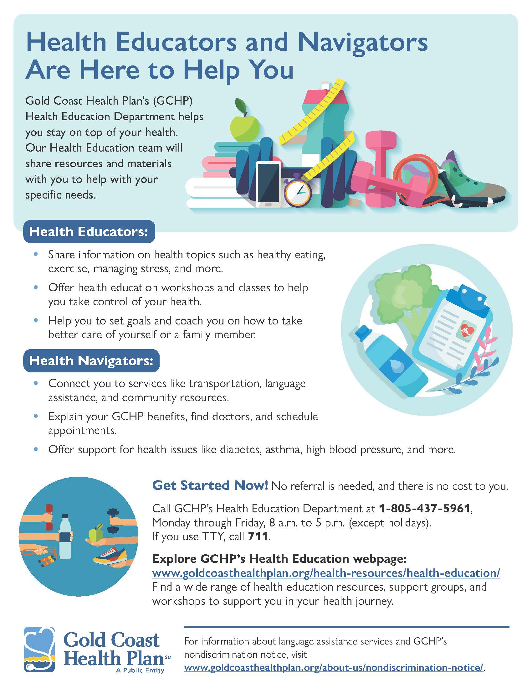 El Programa de educación para la salud de Gold Coast Health Plan (GCHP) tiene por objetivo ayudarle a mantenerse saludable. Trabajamos con clínicas, proveedores y hospitales locales para ofrecer recursos educativos en salud de alta calidad a todos los miembros.